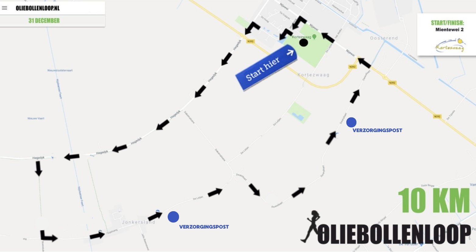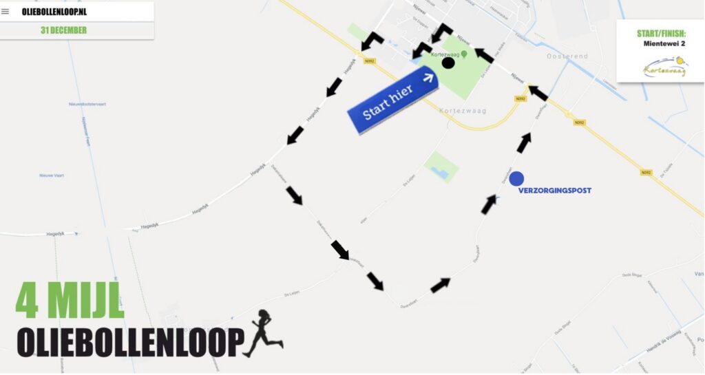 Om 12.15 klinkt het startschot van de 4 mijl. Je start vanaf de parkeerplaats van Sport- en Ontspanningscentrum Kortezwaag. Vanuit daar loop je rechtsaf via de Mientewei en over de Doppen, richting de Hegedyk, waar je via het fietspad bij het eerste km punt komt. In de verte zie je misschien nog een paar lopers die de 10km afstand lopen. Die gaan rechtdoor, jij mag linksaf de Dekemaleane in. De kleine lus op de Leijen is vervallen, dus je mag gewoon rechtdoor! Vervolg de route en ga links de Dwersfeart in. De eerste lopers van de 10 km kunnen hier alweer passeren, blijf daarom zoveel mogelijk rechts lopen! In de verte, daar in de bocht zie je een verzorgingspost. Even op adem komen? Of ga je in 1x door? Op naar de Nijewei om vervolgens de laatste km richting finish af te leggen. Uiteraard wordt de route aangegeven d.m.v. bewegwijzering en staan er verkeersregelaars om jou veilig de route te laten volbrengen.